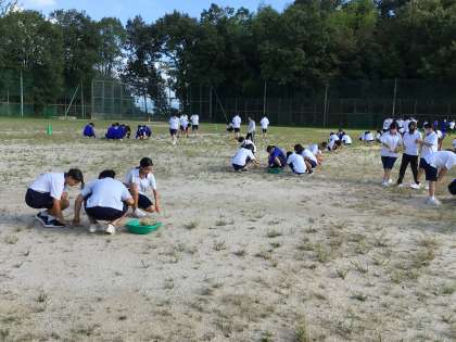 体育祭に向けて、運動場の草を3年生みんなで取りました。