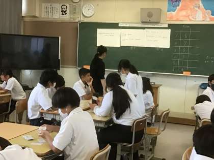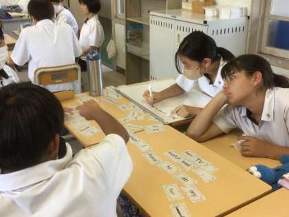 英語では単語カードを組み合わせて意味の通る長い文を作れるようグループごとに考えています。