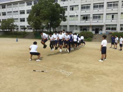 体育では長縄跳びの練習をしています。