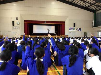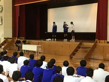 保健スタッフによる保健集会を行っています。「運動って楽しいんだよ」をテーマに、スタッフ長のあいさつ、スタッフによる寸劇、講師による実演を行いました。