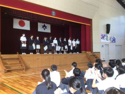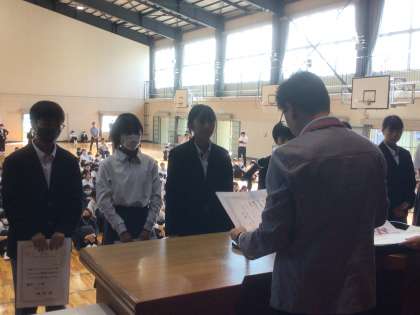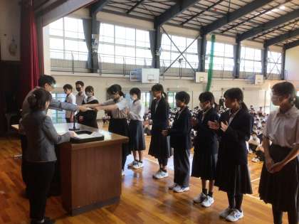 前期の功績を讃え、各学級から1名に学校賞が授与されました。
