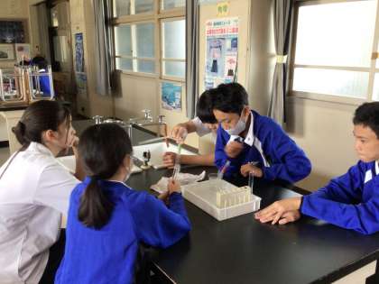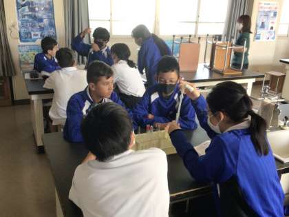 理科では水溶液の実験の進め方を動画で確認し、協力して取り組んでいます。