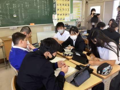 総合的な学習の時間では職場体験レポートをグループで発表し、アドバイスを交わしています。