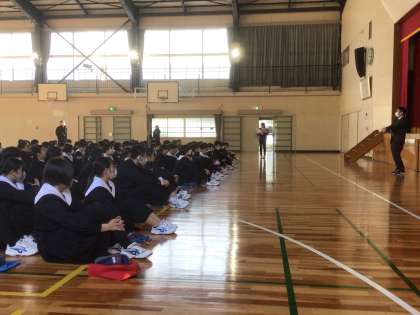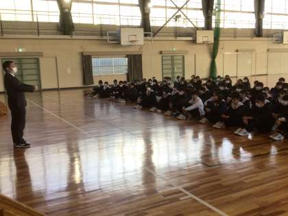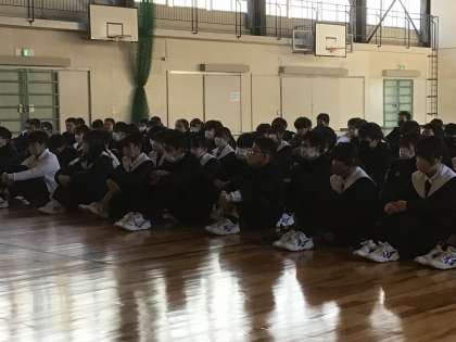 学年主任からの冬休みの生活や卒業に向けての話を真剣に聞いています。