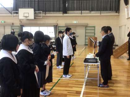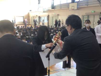 赤い羽根書道コンクール、明るい社会づくり実践体験文、珠算競技大会、科学研究作品、調べる伝えるコンクール、ライオンズクラブ善行生徒表彰、校長特別賞の表彰および表彰伝達を行いました。
