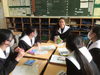 家庭科では完成した布絵本を使って発表会を行っています。
