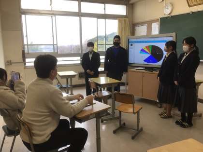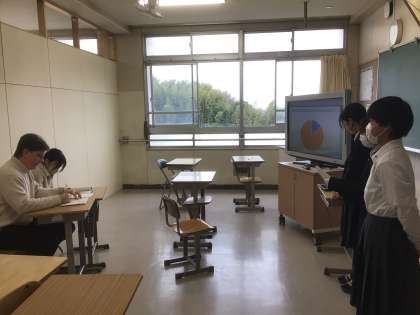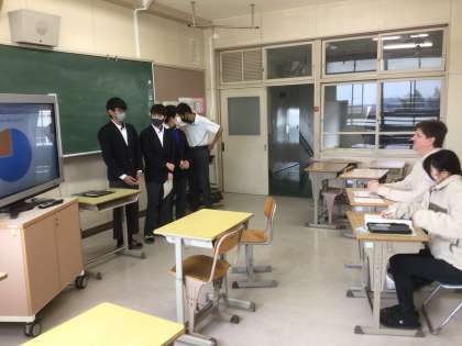 英語ではクラスのみんなにアンケートした結果をプレゼンテーションにまとめ、英語で発表しています。