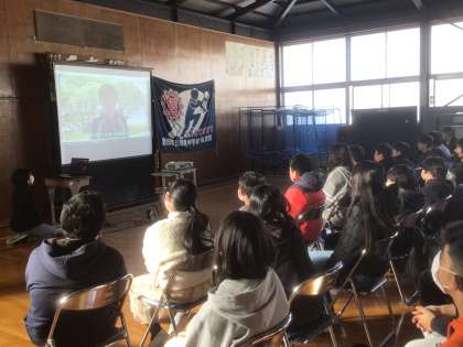 入学説明会で来校した児童たちに、1年生の生徒が挨拶をし、2年生が作った学校紹介ムービー、情報部が作った部活動紹介ムービーを披露しました。