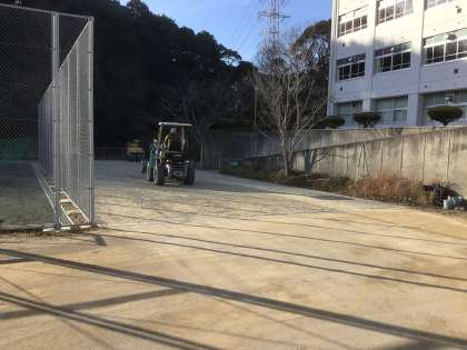 西門から運動場への通路の整地が完了に近づいています。