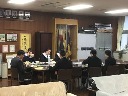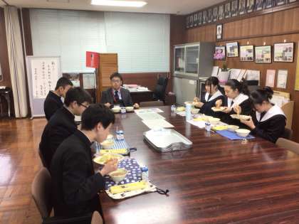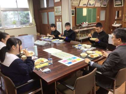 3年生のリーダー会と校長先生が会食を行い、中学校での思い出やそれぞれの夢について話しています。