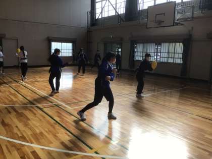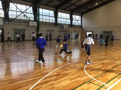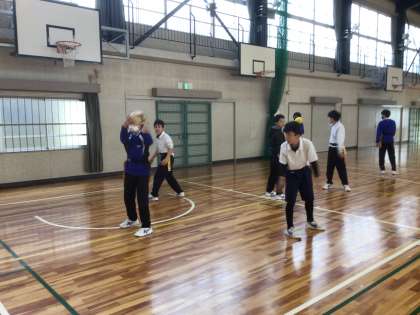 体育ではタグラグビーに取り組んでいます。パス回しの練習をしています。