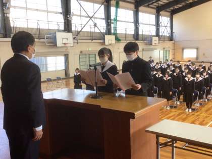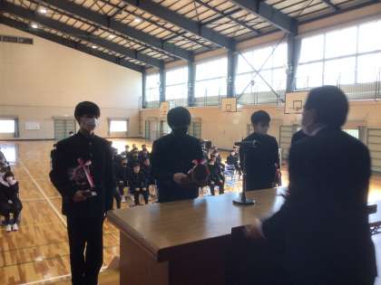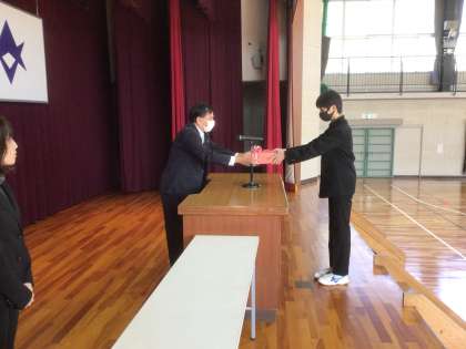 同窓会入会式にて同窓会長より顕彰楯や記念品の授与が行われ、代表生徒が誓いの言葉を述べました。