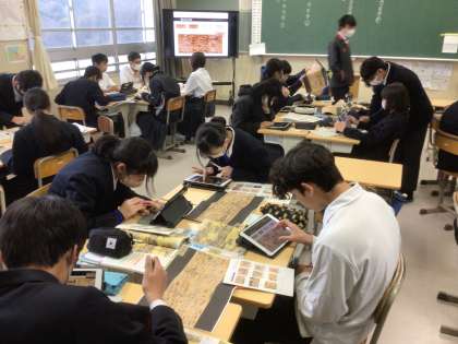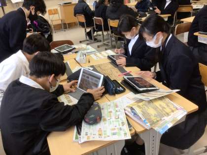 社会科では室町時代の文化について資料から気づいたことをグループで協力して見つけています。