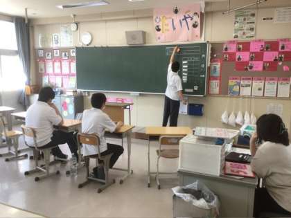 今日も落ち着いた雰囲気の中、朝の会が行われています。朝の会では、健康チェックや1日の目標を決めます。今日の目標は、「体育をがんばろう」になりました。