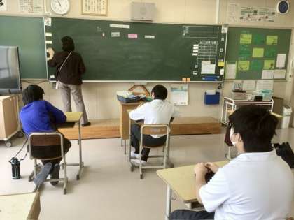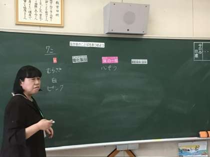 今日は、国語で「ことばあつめ」をやっています。テーマにそった単語を1人ずつ発表しています。今日のテーマは、「色」「電化製品」「運動器具」です。