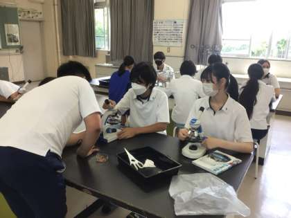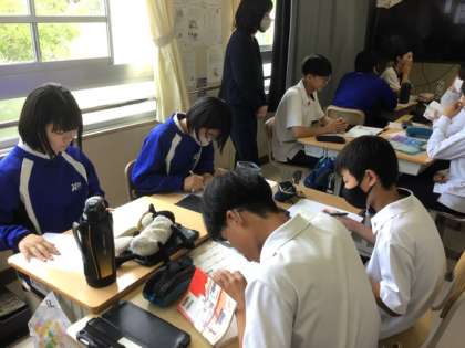 3年生の授業の様子です。今日は学校訪問で、お客様に学校の様子を見ていただきました。写真は理科(細胞の観察)、英語(インタビュー)、総合(読書プログラム)の様子です。