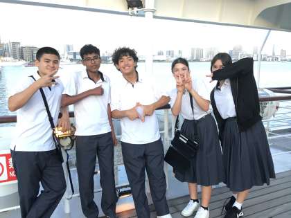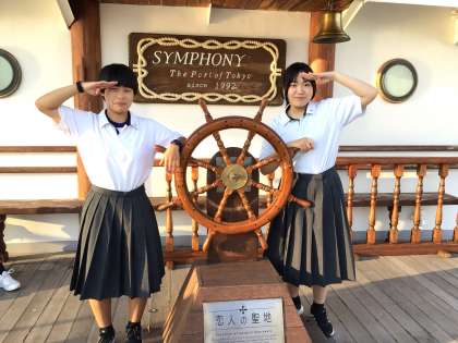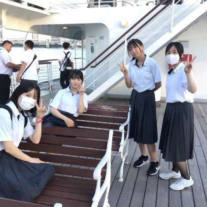 船のデッキに出て、夕方の風を感じることができました。このあとクラス別活動です。