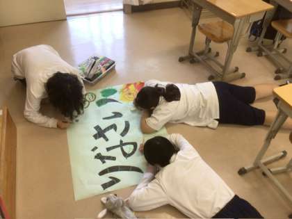 今日は、修学旅行から帰ってくる3年生に向けて「おかえりなさい」の掲示物を制作しています。和気藹々とした雰囲気で取り組んでます。
