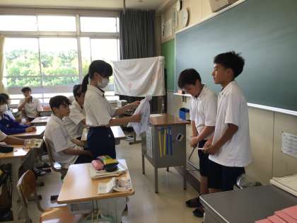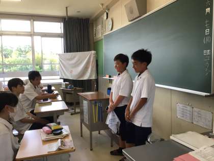 明日からの自然教室に向けて、1年生からてるてる坊主のお守りを受け取りました。明日から元気に行ってきます