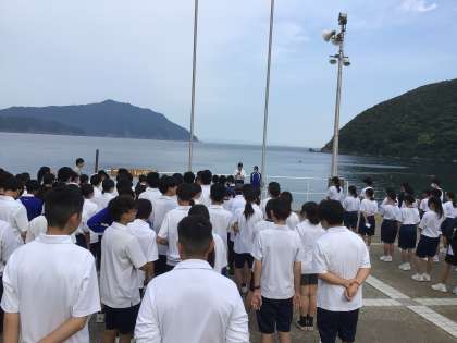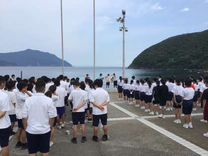 朝のつどいです。今日はみよし南中の生徒と合同です。お互いの学校紹介を行いました。