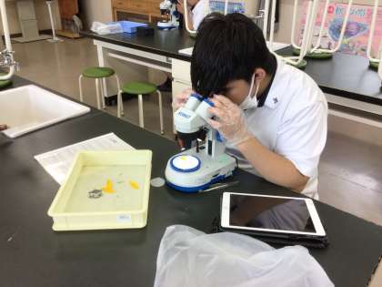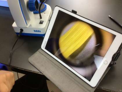 ヒマワリの花びらの観察を行いました。双眼実体顕微鏡を使って観察して、タブレットで写真を撮りました。