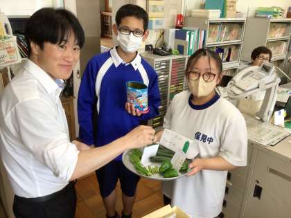 5・6・7・8学級の畑で採れた夏野菜を職員室で販売しました。