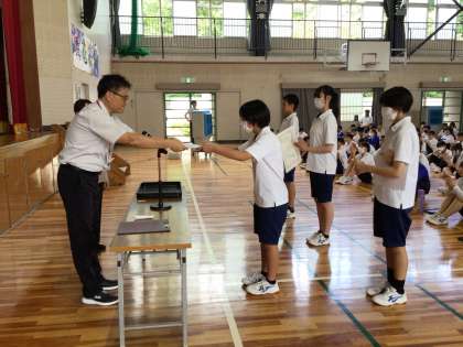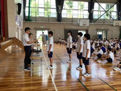 夏休み前に集会を行いました。はじめに表彰を行い、校長先生の話、委員会からの連絡をききました。また、生徒指導の先生から、ネットトラブルのお話をききました。より良い夏休みになるように、安全に気をつけて楽しい休みにしましょう。
