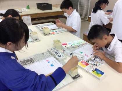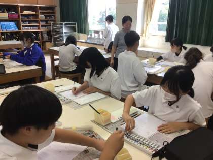 1年生美術の授業の様子です。筆やパレットの正しい使い方を学びました。