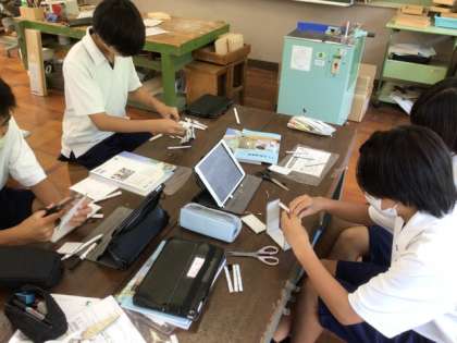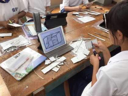 技術科では、ミニチュアの模型を作り、設計の基礎を学んでいます。実際の木材加工を行なう前に、必要なパーツをダンボールから切り出し、体験的に学習することができました。