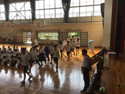 1時間目に避難訓練を行いました。地震発生後、火災が発生して、避難をする想定で訓練をしました。放送を聞いて、それぞれの活動場所から落ち着いて避難することができました。