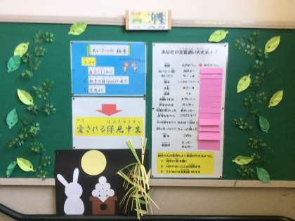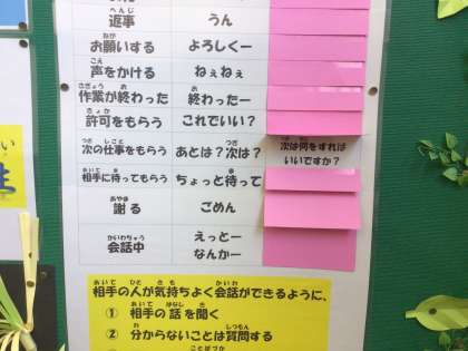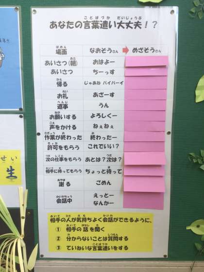 2年生の掲示板です。職場体験を意識した掲示物ですね。正しい言葉使いを身につけて