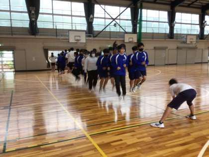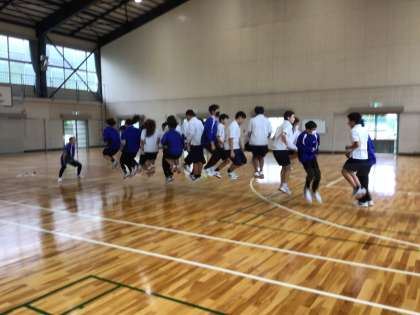 雨天のため、体育館で大縄跳びの練習をしています。