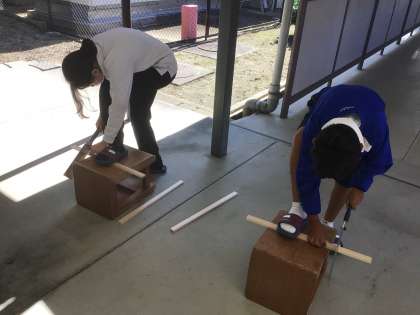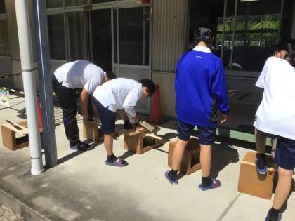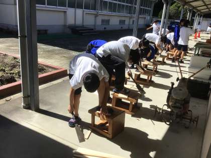 木材加工の授業です。けがきの線に沿って、ノコギリを使って材料を切り出しています。悪戦苦闘しながら頑張っています。