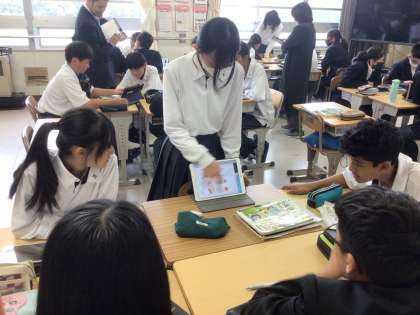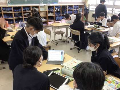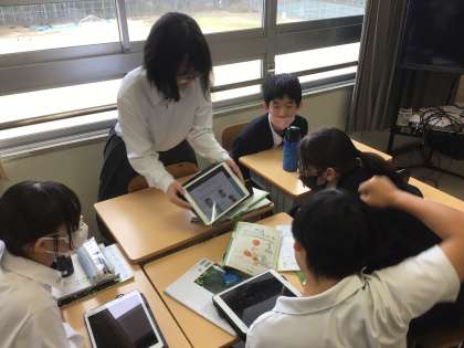 タブレットを使って、英語のスリーヒントクイズを作成して、問題を出しているところです。オールイングリッシュで、とても盛り上がっていました。