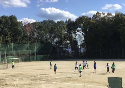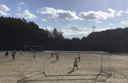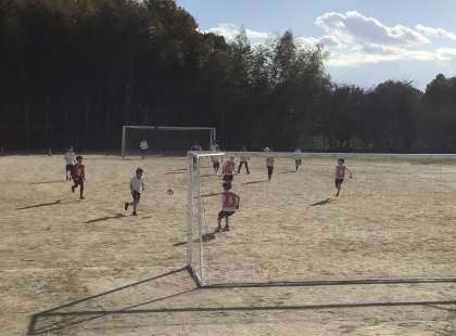 3年生の授業の様子です。秋晴れの空の下、サッカーの授業を頑張っています。