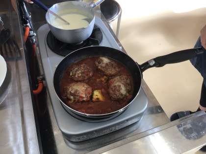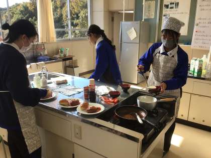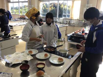 家庭科の授業の様子です。今回は、ハンバーグとコーンスープを作りました。