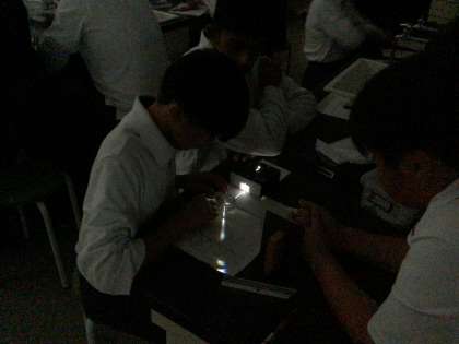 1年生の授業の様子です。光源装置を使って、光の進み方の実験を行いました。ひとりひとり、予想を立てて、実験で自分の考えを確かめていました。