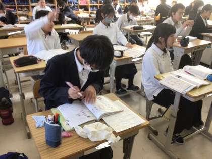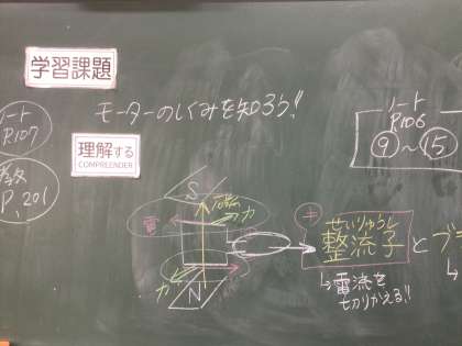 理科の授業の様子です。フレミングの左手の法則を使ったモーターの問題に取り組んでいます。