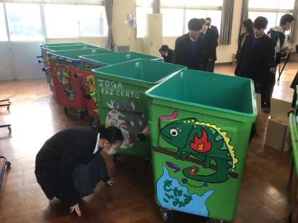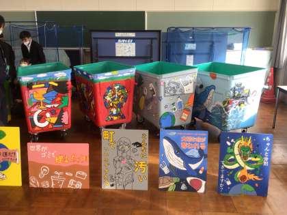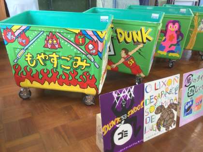 昨日生徒たちでペイントした、ダストボックスと看板を昨夜遅くまで、アーティストさんたちが仕上げてくださいました。