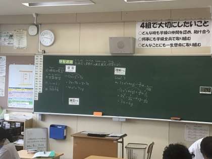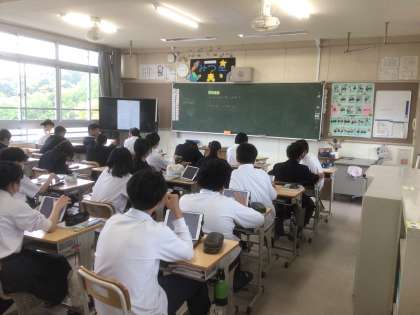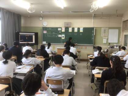 保見中学校では、全員が「思考を動かす授業」を目標に授業作りに励んでいます。活動プレートを黒板にはり、どんな活動をしているのかをわかりやすくしたり、授業内容をイメージしやすくするため大きな写真をはったりして、生徒たちが思考を動かしやすくなるよう工夫しています。また、話し合い活動を通して仲間同士の考えを聞き合い考えを深めあったりしています。