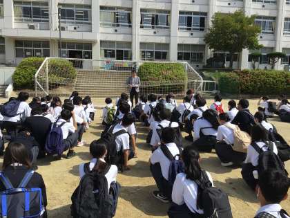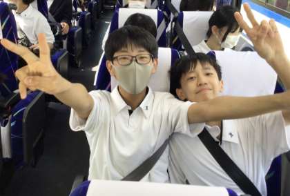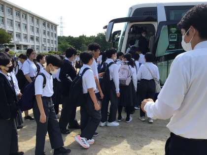 出発する前に級長会長と校長先生の話を聞き、「いってきまーす!!」と元気よくあいさつをして、バスに乗り込みます。