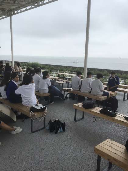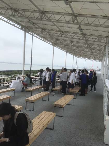 最初の目的地である万博会場に到着しました。パビリオンの時間待ちも兼ねて休憩中です。