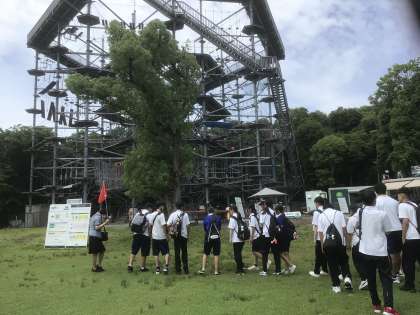 いよいよアスレチック体験です。想像以上に大きく、スリルがあり楽しめそうです。現在、安全講習を受けています。