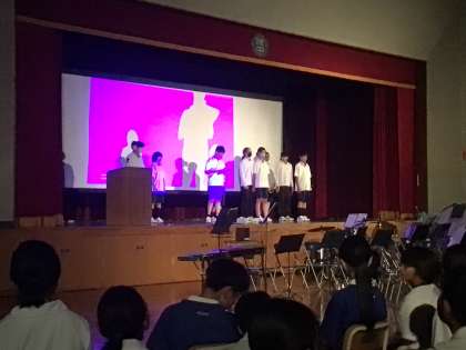 生徒会が進行し、情報部、美術部、キャリアアップ部、吹奏楽部がそれぞれ発表しました。