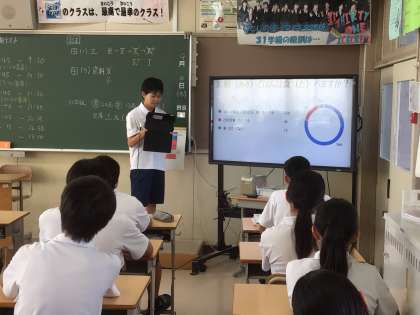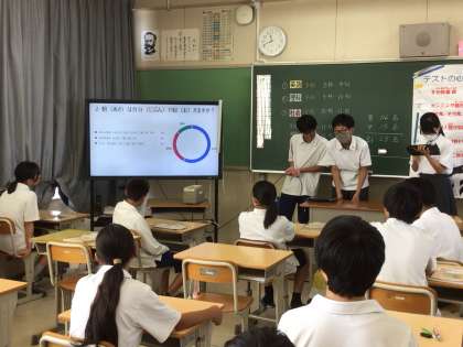 テスト終了後、保健スタッフによる生活習慣のアンケートの発表を行いました。タブレットを使って、グラフを提示するなど、わかりやすく発表していました。