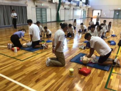 消防士さんや、講師をお招きして、救命救急の講習を受けました。人形を使って、心臓マッサージの練習をするなど、大変勉強になりました。