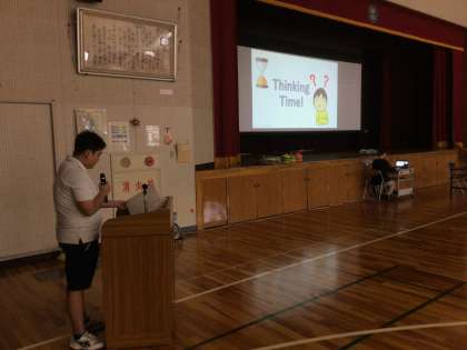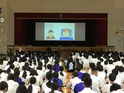 学校保健集会が行われました。今年度は、中京大学の教授を講師としてお招きして、睡眠の大切さについて教えていただきました。はじめに、保健スタッフから睡眠についての発表を行いました。