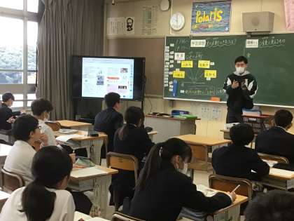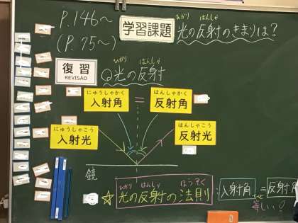 1年生の理科の授業の様子です。光の反射についてのまとめの授業です。入射角、反射角など、重要語句をや関係について学習しています。