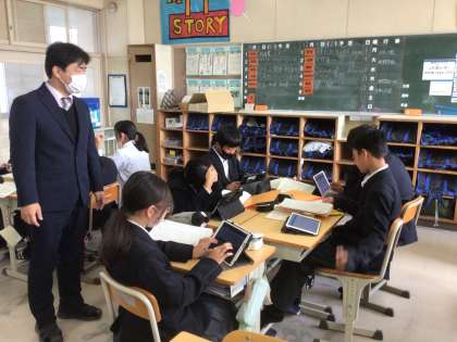 1年生の国語の授業の様子です。故事成語を使って、作文を書いています。ワークシートやタブレットを使って学習を進めています。グループで話し合いながら取り組んでいます。
