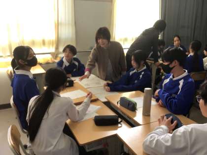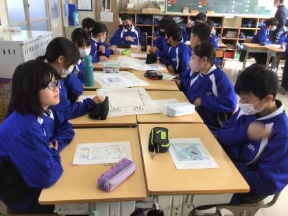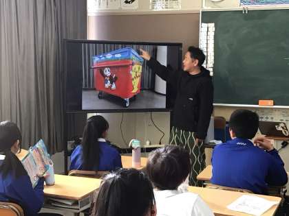 1年生の総合的な学習では、地域の環境問題に着目し、保見団地にアートデザインしたダストボックスを設置する取り組みを行なっています。今日はアーティストさんに来ていただき、デザインを考えみんなで話し合いました。